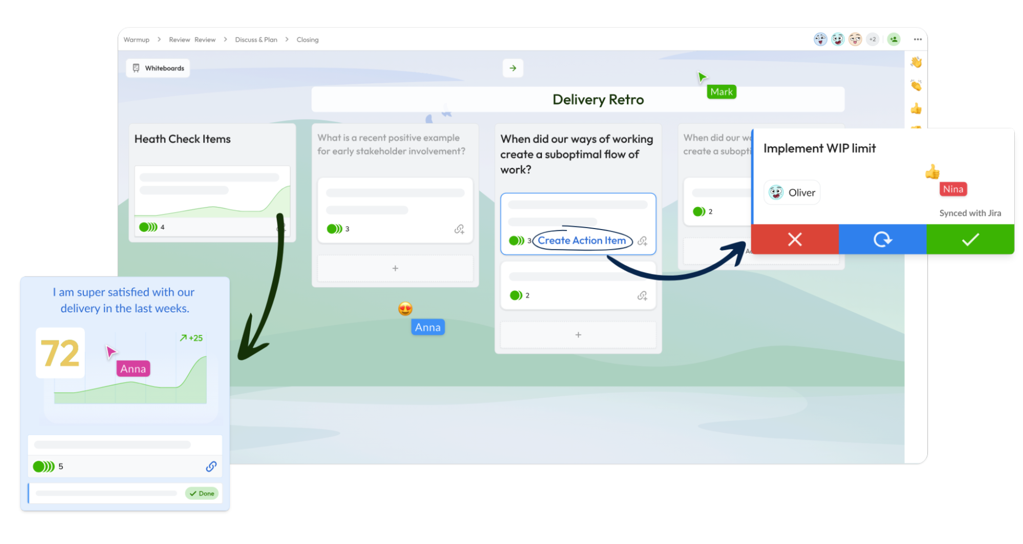 Neatro offre une large gamme de fonctionnalités permettant d’animer des rétrospectives de qualité, mais aussi tout ce dont vous avez besoin pour suivre l’évolution des actions ainsi que pour prendre le pouls de l’équipe.